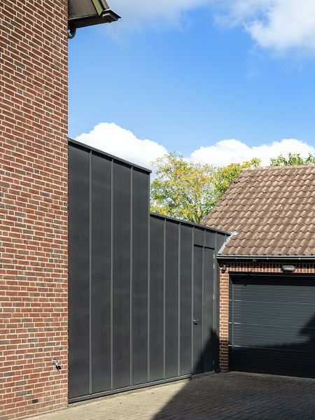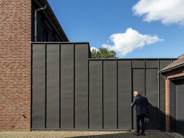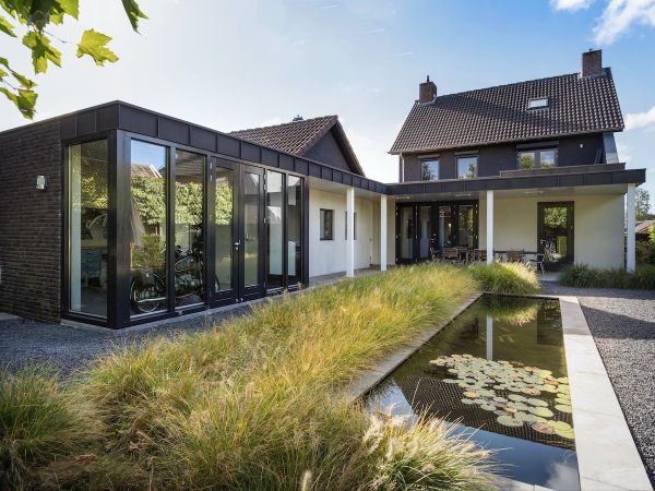 Een nieuwe stijlvolle eetkamer en een fraaie stalling voor een oldtimer motor worden door middel van een overkapping met elkaar verbonden.