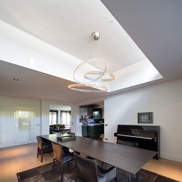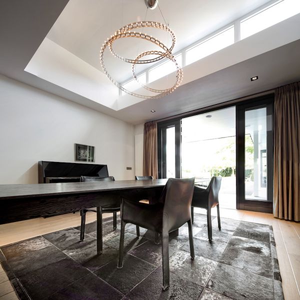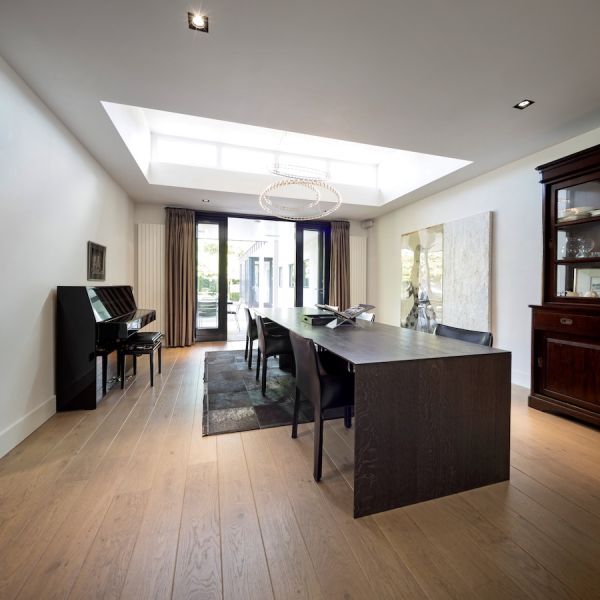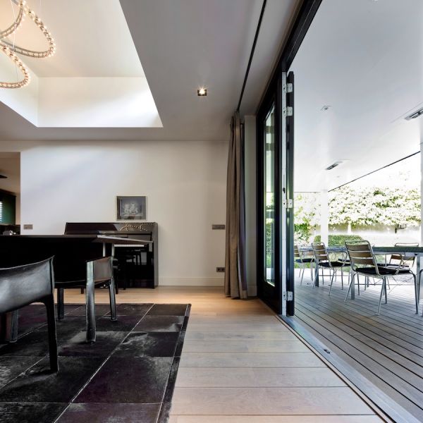 Ochtendzon valt via de bovenlichten de verhoogde kamer binnen. Een riante vierseizoenenpui verbindt de woning met het ruime terras. De deuren van de pui kunnen volledig worden opengezet waardoor de woning en het ruime terras drempelloos in elkaar overgaan.