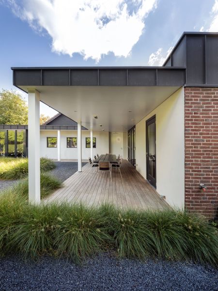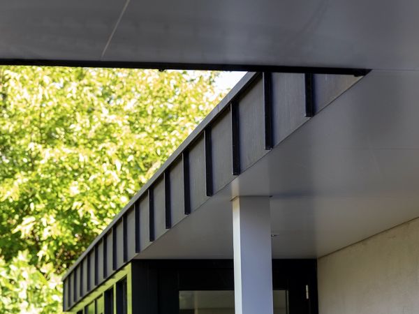 Het terras heeft een mooie houten vloer, lichtgrijs gestucte wanden en wit plafond. Houten kolommen zijn in een aangenaam ritme geplaatst en samen met de antracietkleurige zinken dakrand krijgt deze woning de allure van een villa.